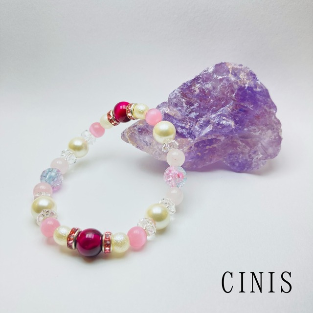 天然石ブレスレット004 こちらの商品は チェリークォーツを主役に ローズクォーツ、ホワイトキャッツアイ、 水晶、パールビーズで仕上げました 画像では分かりにくいですが チェリークォーツの横のパールビーズのみ ほんのりピンク色です パールビーズは全てガラス製なので しっかりとした重量感があります 非常に可愛らしく、恋愛面をサポートする パワーストーンを取り入れているので 是非、デートにつけて行って欲しいです! 使用されている天然石の意味や効果などは 用紙をお付けしておりますので そちらでご確認くださいませ(*・ω・)*_ _) 貴方を更に良い方向へと 導いてくれますように(*ˊᵕˋ*)✩*.゚ サイズは15号で作りました (多少の誤差はご容赦ください) 一つ一つ丁寧に手作りしております 天然石を使用している為、多少の傷や内包物、 柄の違いなどはご了承ください ※ブレスレットのみの出品です この商品は常に浄化を行っております (画像3枚目参照)